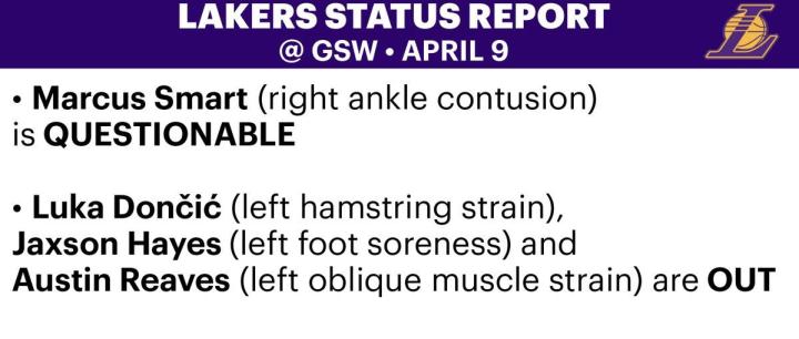 扫描下载懂球帝首页>动态> 湖人更新伤情报告:詹姆斯能出战勇士,东契奇、里夫斯仍缺阵