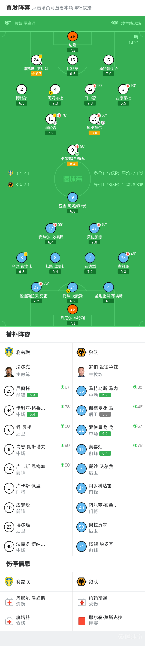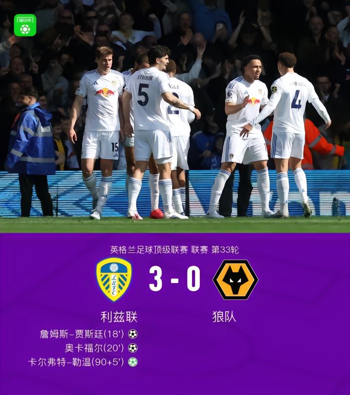 北京时间4月18日英格兰足球顶级联赛第33轮,利兹联主场对阵狼队。詹姆斯-贾斯廷倒钩首开纪录,随后奥卡福尔接队友传中推射完成本场传射建功,比赛最后阶段卡尔弗特-勒温点球破门锦上添花。最终比分利兹联 3-0 狼队。
