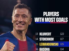 莱万已为巴萨打进115球,独享队史射手榜第15名