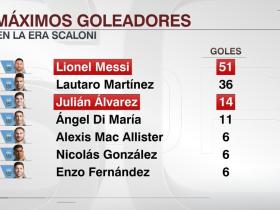 斯卡洛尼治下阿根廷队射手榜:梅西51球第一,小蜘蛛14球第三
