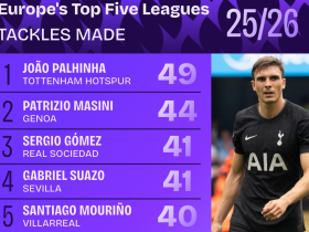 本赛季至今欧洲五大联赛抢断榜:帕利尼亚49次居首