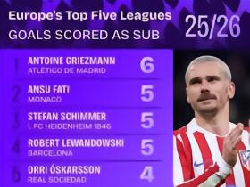 五大联赛替补射手榜:格列兹曼6球居首,莱万5球,谢什科4球