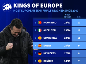 00年以来晋级欧战4强最多的10位主帅:穆帅12次第1,埃梅里第4