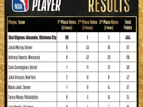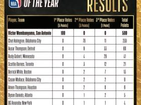 NBA DPOY具体票数:文班100张第一选票,切特获76张第二选票