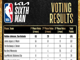 NBA最佳第六人投票明细:凯尔登-约翰逊获68张第一选票