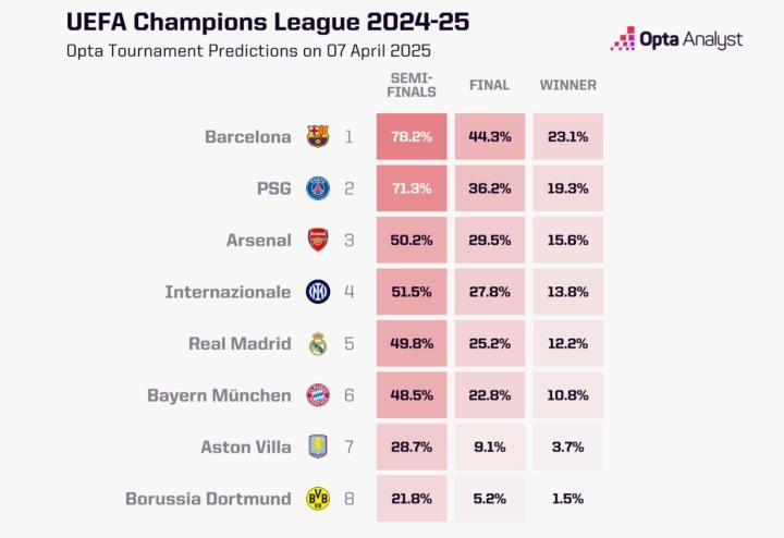 扫描下载懂球帝首页>动态> Opta更新欧冠夺冠概率:巴萨23.1%领跑,巴黎次席,皇马排第5