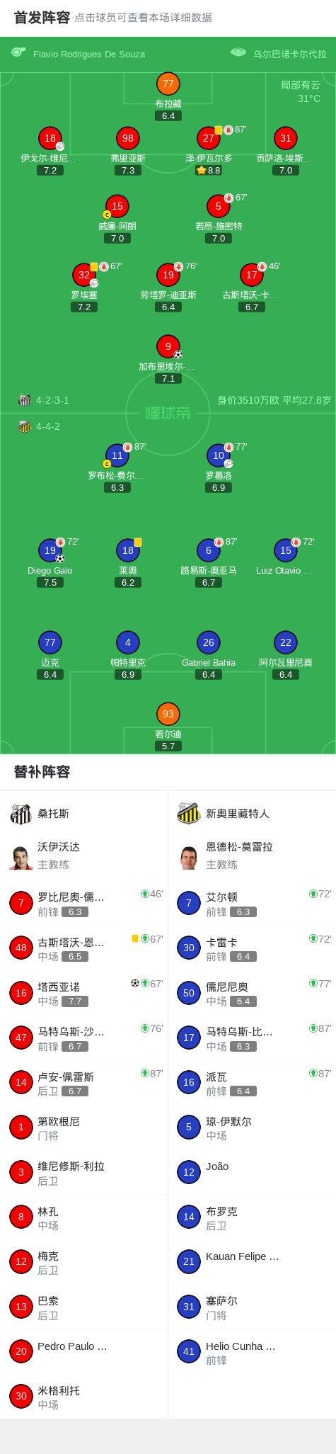 桑托斯2-0贝伦赛艇,塔西亚诺建功,莫伊塞斯锁定胜局