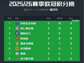欧冠积分榜:巴黎、拜仁、国米、枪手、皇马均全胜积9分领跑