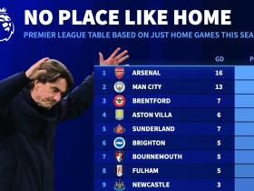 本赛季英超主场战绩榜:阿森纳19分居首,热刺5分倒数第二