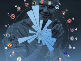 哈兰德英超100球分布:狼队10球最多,西汉姆9球、曼联8球