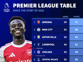 2025年英超积分排行:枪手71分居首,曼城68分第二,维拉第三