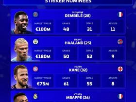 德转评年度最佳前锋:登贝莱、哈兰德、凯恩、姆巴佩入围
