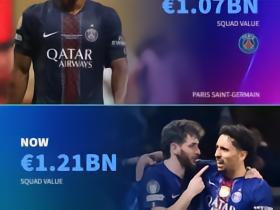 德转盘点本赛季身价上涨最高球队:巴黎1.42亿欧第一,考文垂在列